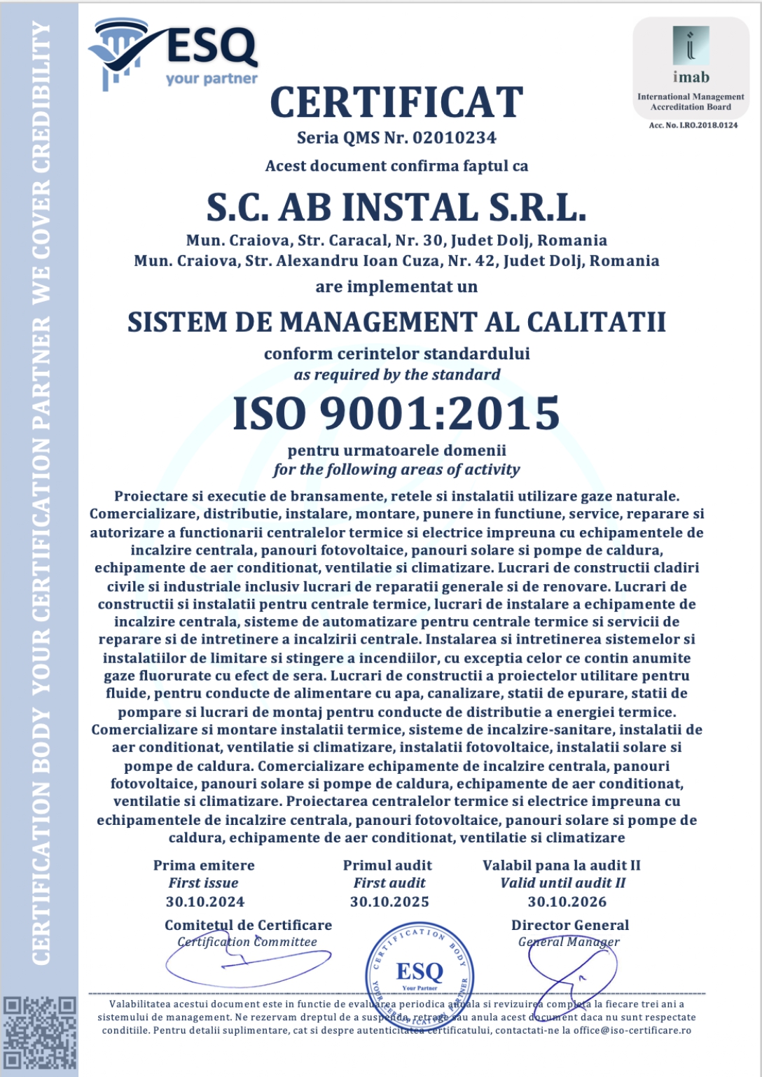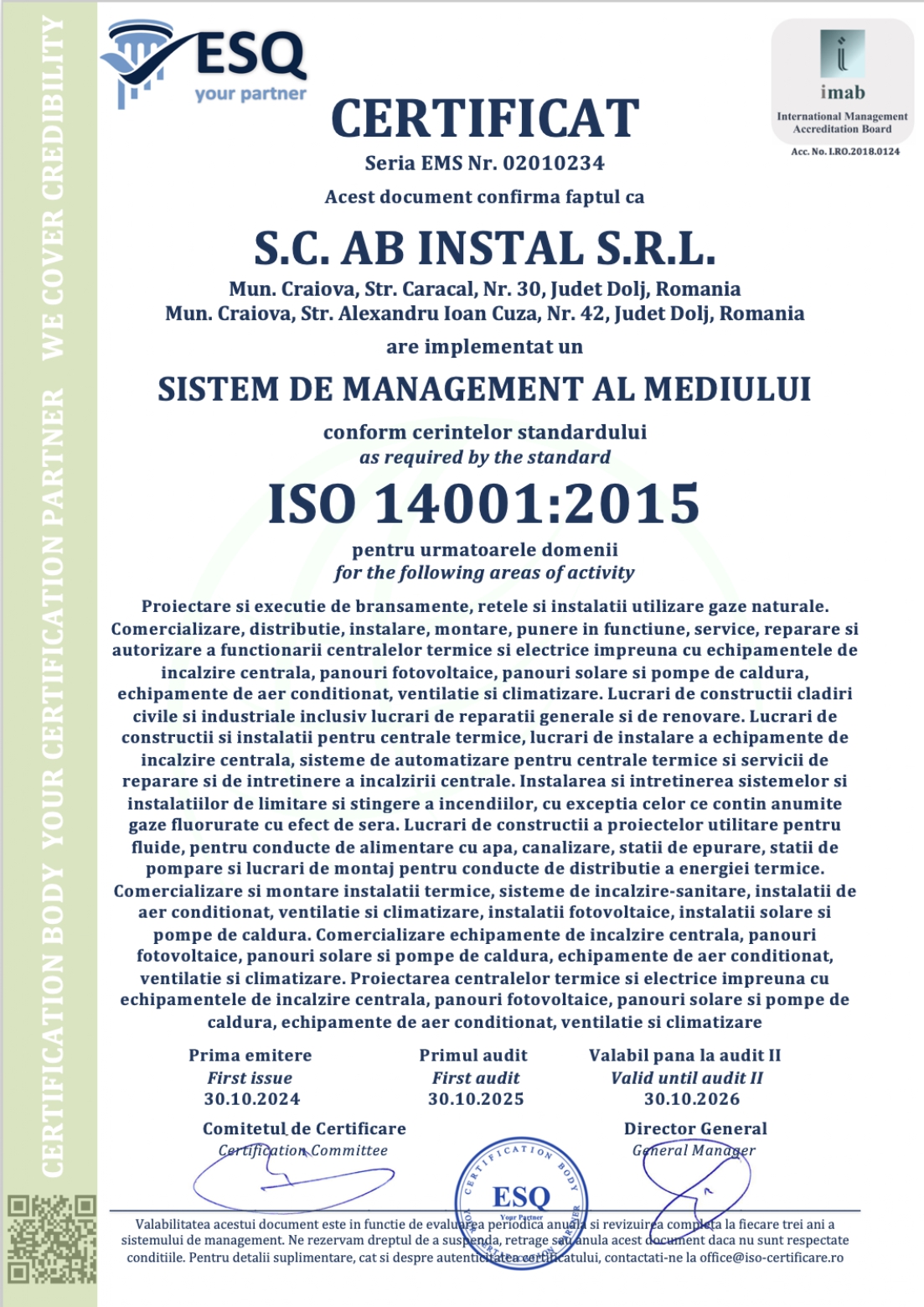 AB INSTAL investește constant în perfecționare și conformitate. Suntem autorizați conform standardelor ISO și deținem certificări relevante pentru calitate si mediu